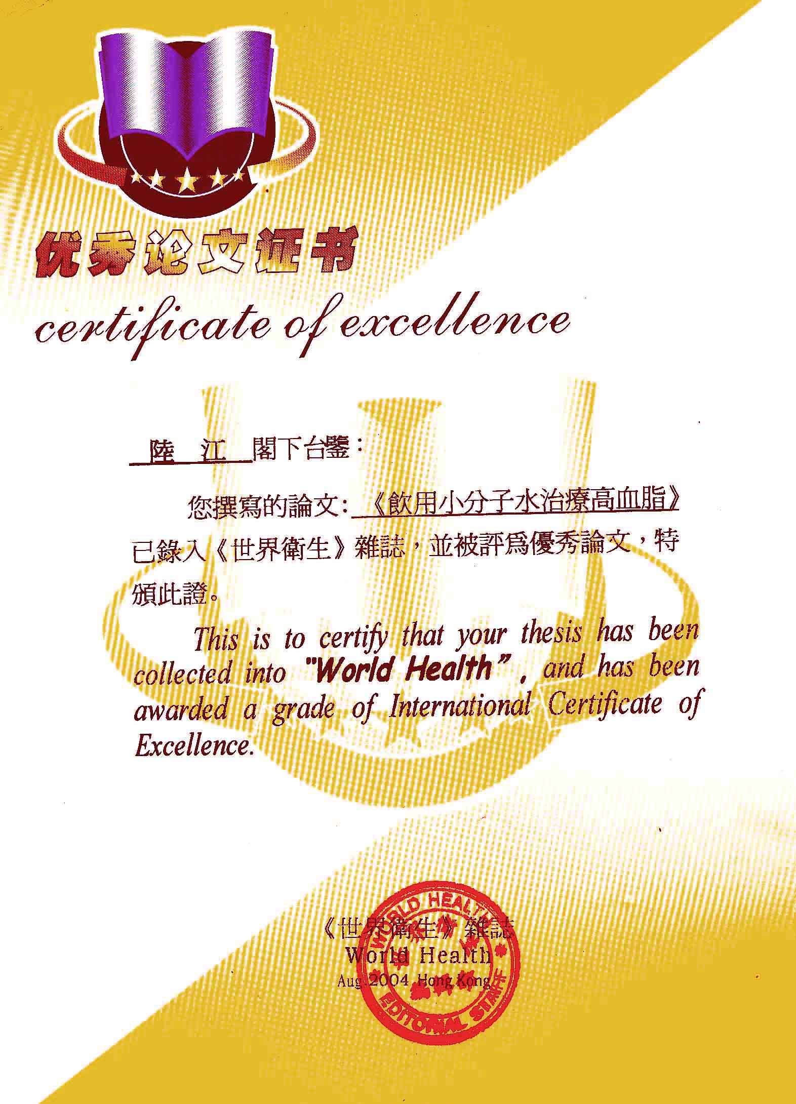 《飲用小分子水治療高血脂》獲優(yōu)秀論文獎(jiǎng)