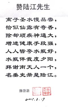 3. 詳細(xì)了解請(qǐng)上網(wǎng),可見(jiàn)臨床報(bào)告,鑒定證書、專家評(píng)說(shuō)、治病機(jī)理、用戶反饋、題詞、詩(shī)歌、錦旗等彩色掃描件,被譽(yù)為"神奇水瓶"。