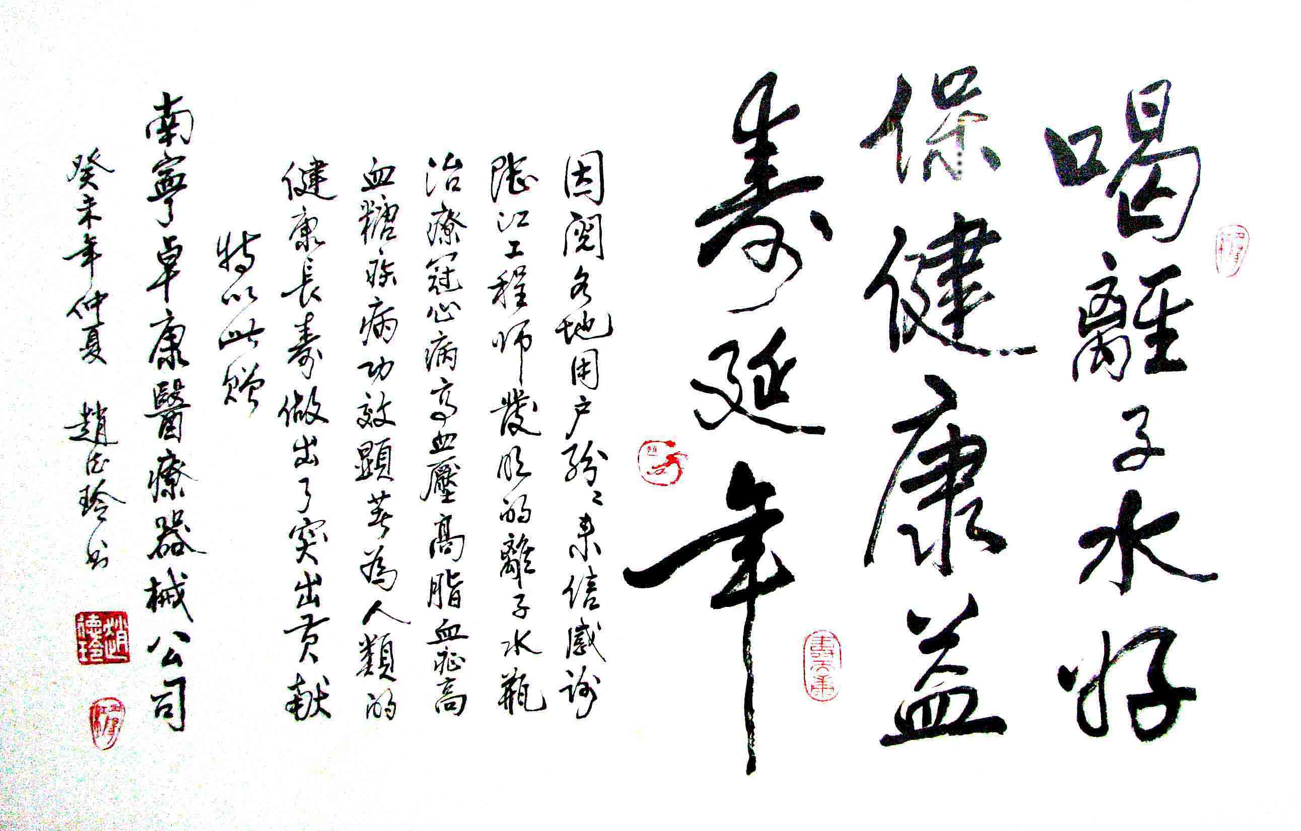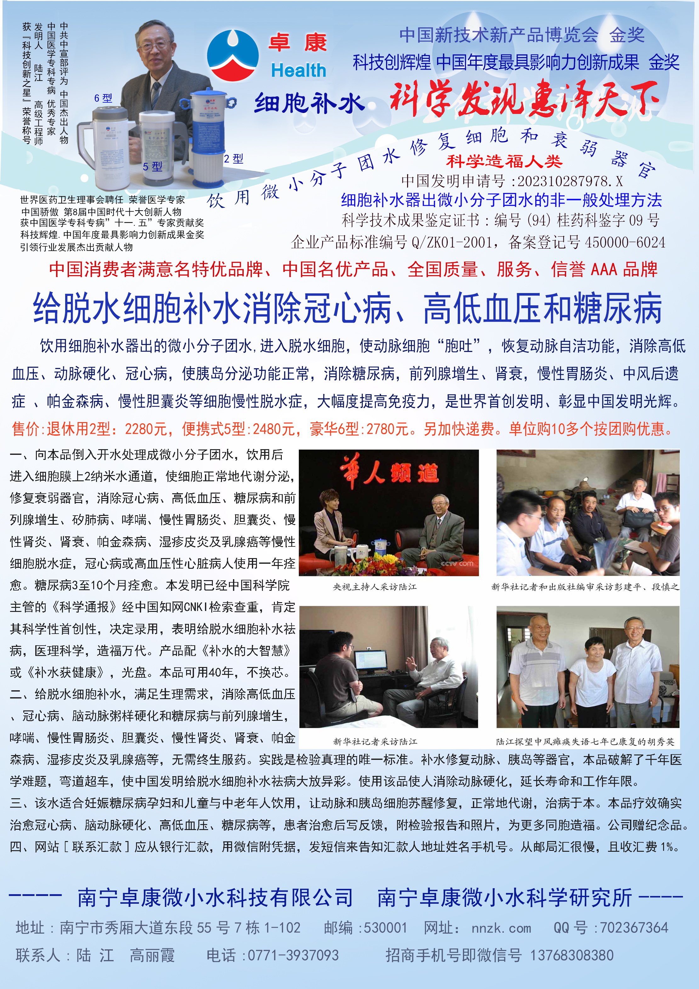 - -----南寧卓康微小水科技有限公司原為南寧卓康醫(yī)療器械有限責(zé)任公司 ,用戶普遍反饋高血壓患者飲用2—5個(gè)月,癥狀消除,不再服藥,治愈了高血壓; 冠心病患者,包括已做和未做支架或搭撟手術(shù)者,經(jīng)3—5個(gè)月飲用,消除心痛、胸悶、早搏、房顫和心絞痛等癥狀,逆轉(zhuǎn)至消除動(dòng)脈粥樣硬化和斑塊,一年左右治愈冠心病,心腦電圖正常,經(jīng)冠脈造影掃描無(wú)明顯狹窄,表明冠心病痊愈;糖尿病人飲用3-10個(gè)月,血糖尿糖正常,治愈2型糖尿病; 并且使前列腺增生、低血壓、腦萎慢性咽喉炎、慢性氣管炎、支氣管炎、哮喘、矽肺病、甲亢、慢性胃腸炎、膽囊炎、慢性腎炎、腎衰、風(fēng)濕性關(guān)節(jié)炎、痔瘡和濕疹皮炎及中風(fēng)癱瘓或偏癱失語(yǔ)后遺癥等不藥而愈,且多病同治,無(wú)需終生服藥,彌補(bǔ)了幾千年來(lái)藥物的欠缺,使“微小水”成為人類消除高血壓、冠心病和糖尿病的寶貴資源。腦動(dòng)脈粥樣硬化、低血壓和前列腺增生患者,一般飲用四個(gè)月痊愈;中風(fēng)后遺癥患者,一般飲用8個(gè)月痊愈。請(qǐng)?jiān)旈啞队脩舴答仭窓谀恐写罅炕颊叩姆答佇拧z測(cè)報(bào)告,有的還附照片。產(chǎn)品屢獲大獎(jiǎng),論文也屢獲一等獎(jiǎng)。廣大用戶好評(píng)不斷,有口皆碑。