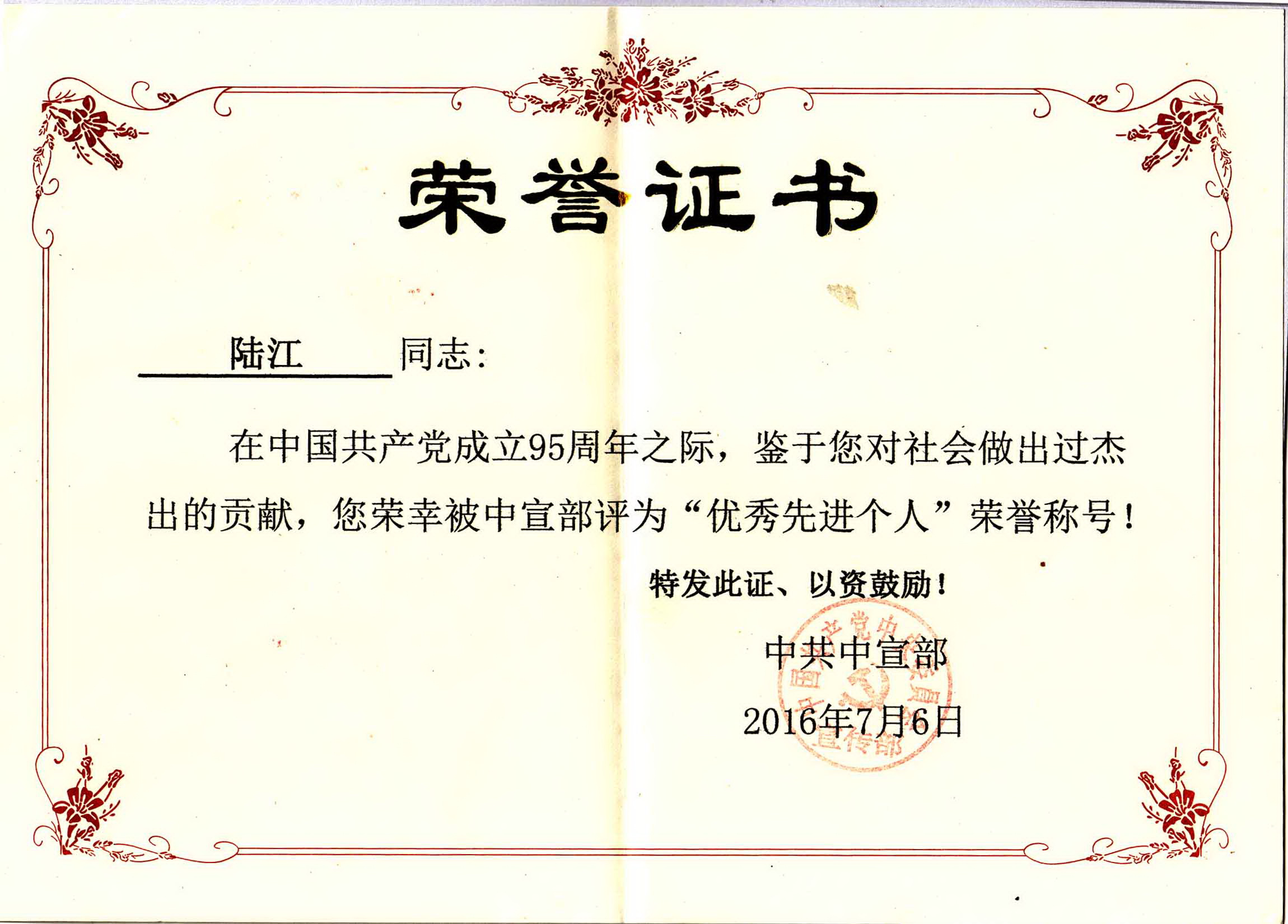 陸江的杰出貢獻(xiàn)被人民日?qǐng)?bào)社評(píng)為先進(jìn)個(gè)人