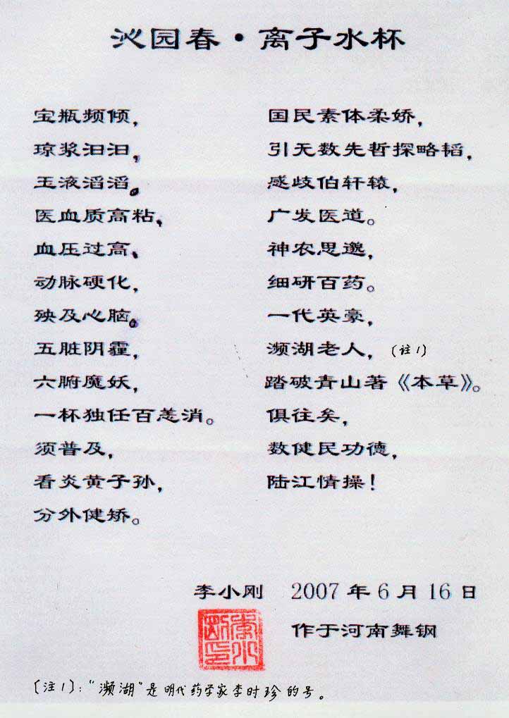 -----我是從事建筑的高工,本來(lái)沒(méi)有資格去攻克醫(yī)學(xué)難題,卻為了自身健康才扣響醫(yī)學(xué)的大門。由于我1990年患高血壓,因怕中風(fēng)才研究發(fā)明了離子水瓶,我把水處理成微小分子團(tuán)水,飲用后治愈了高血壓。便于1993年底送到三家省級(jí)醫(yī)院做臨床試用4個(gè)月。經(jīng)北京和廣西醫(yī)學(xué)專家鑒定:"降脂降壓效果好"," 能擴(kuò)大心腦動(dòng)脈流量,改善心腦電圖以及微循環(huán)","對(duì)治療心腦動(dòng)脈粥樣硬化、高血壓、高血脂有良好的醫(yī)療保健作用。""產(chǎn)品的技術(shù)性能和療效達(dá)到了同類產(chǎn)品的國(guó)內(nèi)領(lǐng)先水平,經(jīng)廣西醫(yī)學(xué)科學(xué)情報(bào)研究所檢索,未見(jiàn)國(guó)外有類似報(bào)道。"中國(guó)醫(yī)學(xué)科學(xué)院張正國(guó)教授從美國(guó)國(guó)立醫(yī)學(xué)圖書館數(shù)據(jù)庫(kù)存Medline檢索英俄文資料,均未見(jiàn)類似報(bào)告。2000年上市后,我為了對(duì)消費(fèi)者負(fù)責(zé)而繼續(xù)觀察研究,一直通過(guò)《信譽(yù)卡》和《質(zhì)量跟蹤調(diào)查書》向患者承諾療效,請(qǐng)用戶使用6個(gè)月后反饋效果。和脂壓患者飲用2至5個(gè)月內(nèi),消除癥狀,停服藥物,血壓正常;冠心病患者飲用3~5個(gè)月逐漸減輕至消除心絞痛、房顫等癥狀,不再服藥,飲用1年左右心電圖正常,經(jīng)冠脈造影掃描無(wú)明顯狹窄,表明冠心病痊愈。大量患者還反映許多衰弱器官被修復(fù),讓前列腺增生、慢性咽喉炎、慢性氣管炎、支氣管炎、慢性胃炎、腸炎和膽囊炎等不藥而愈;2型糖尿病患者是因?yàn)橐葝u衰弱致病,飲用該水半年至一年,逐漸減藥至停藥,血糖尿糖正常,真正治愈2型糖尿病。中風(fēng)后遺癥患者飲用六七個(gè)月,可逐漸減輕至消除肢體和語(yǔ)言障礙,表明飲用該水能讓壽命很長(zhǎng)的神經(jīng)元細(xì)胞逐漸修復(fù),奇跡般地恢復(fù)肢體和語(yǔ)言功能。飲用后還使胸腺和脾臟兩個(gè)重要的免疫器官被修復(fù)和增強(qiáng),產(chǎn)生免疫細(xì)胞多,提高了免疫力,使人不生病或少生病。自此, 飲用微小分子團(tuán)水創(chuàng)造了攻克冠心病、高(低)血壓和糖尿病三大醫(yī)學(xué)難題的奇跡。人們對(duì)此感到不可思議,但實(shí)踐是檢驗(yàn)真理的唯一標(biāo)準(zhǔn)。