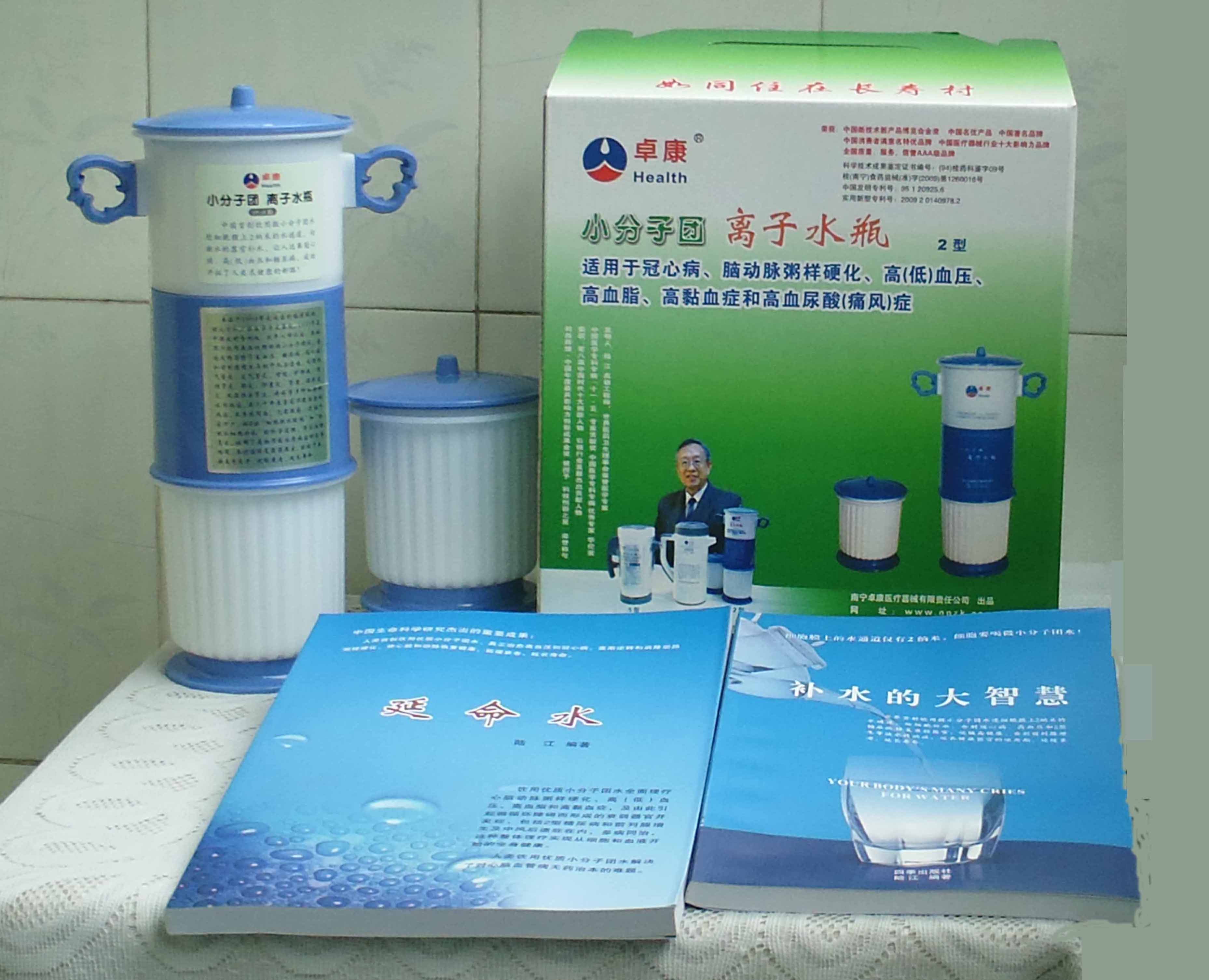 本品大量用戶的使用效果表明,能治愈冠心病、腦動(dòng)脈硬化、原發(fā)性高(低)血壓、高血脂、高粘血癥、高血尿酸癥(痛風(fēng))和2型糖尿病、衰弱器官并發(fā)癥(前列腺增生、腎衰與尿毒癥)及中風(fēng)后遺癥等療效好。產(chǎn)品配信譽(yù)卡。使用壽命30年,不換芯,易清洗。團(tuán)購(gòu)優(yōu)惠。從郵局匯款,匯費(fèi)1%,地址按本頁(yè)下方地址、聯(lián)系人寫。從銀行匯款,請(qǐng)點(diǎn)擊[聯(lián)系匯款]欄,從工商銀行匯款,建設(shè)銀行、農(nóng)業(yè)銀行匯款,均免收匯費(fèi),匯款后20--30分鐘內(nèi)發(fā)短信,可用微信轉(zhuǎn)帳,均免匯費(fèi),微信號(hào)即手機(jī)號(hào)13768308380。匯款后,告知你的姓名和地址,我公司聯(lián)系人手機(jī)號(hào)是:13768308380卓康牌離子水瓶為我公司獨(dú)家生產(chǎn),郵購(gòu)產(chǎn)品配《補(bǔ)水的大智慧》彩印書一本,另配四季出版社出版的新書《補(bǔ)水的大智慧》一本,并配光盤一張(含央視主持人釆訪陸江的對(duì)話視頻)。目前市場(chǎng)和"淘寶網(wǎng)"上有人兜售假冒的偽品,望讀者審察辯別真?zhèn)危旒僬哓飧`假冒本公司的各種認(rèn)證、獲獎(jiǎng)獎(jiǎng)項(xiàng)、專利號(hào)和外包裝盒上的中英文字,包括科技成果的鑒定意見(jiàn)等,請(qǐng)讀者注意防偽。如何識(shí)別假貨?已經(jīng)買了假貨怎么辦?(請(qǐng)點(diǎn)擊[打假掠影][打假掠影])。